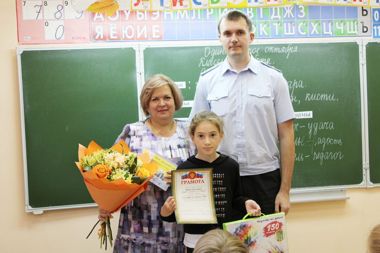 Жюри единодушно объявило победителем конкурса юных кулинаров и знатоков ПДД «Светофор на тарелке - 2022» школьницу Дарью Кириллову. Денис Михайлович под аплодисменты членов отряда ЮИД, одноклассников Дарьи, вручил девочке грамоту победителя и набор для творчества, пожелав активной жизненной позиции, успехов в учебе и новых побед.